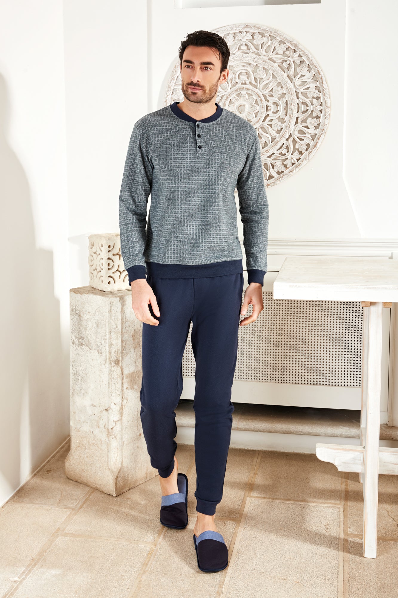 Distinguiti anche nei momenti di relax con questo raffinato pigiama da uomo in jacquard, perfetto per chi cerca uno stile ricercato unito alla massima comodita'. Composizione : 65%poliestere-30%cotone-5%altrefibre