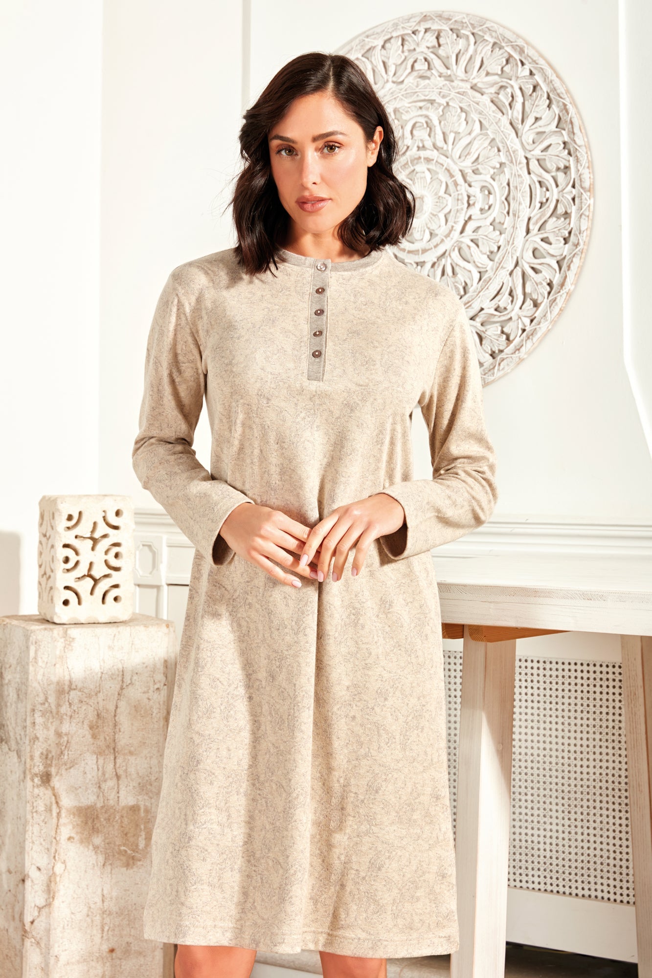 Una camicia da notte in jacquard e' un capo da notte elegante e raffinato, che unisce il comfort della biancheria da casa con la preziosita' di un tessuto lavorato con cura artigianale. Composizione : 65%poliestere-30%cotone-5%altrefibre