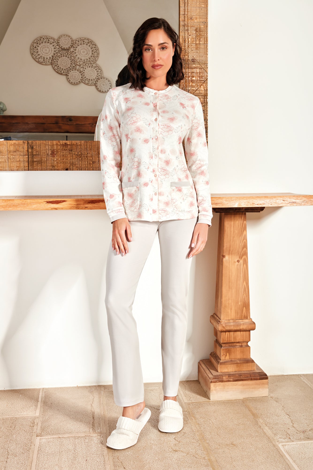 Un pigiama da donna con giacca aperta in caldo cotone e' un classico intramontabile del guardaroba notte, pensato per offrire comfort, eleganza e calore naturale nelle stagioni piu' fresche. Composizione : 100%cotone