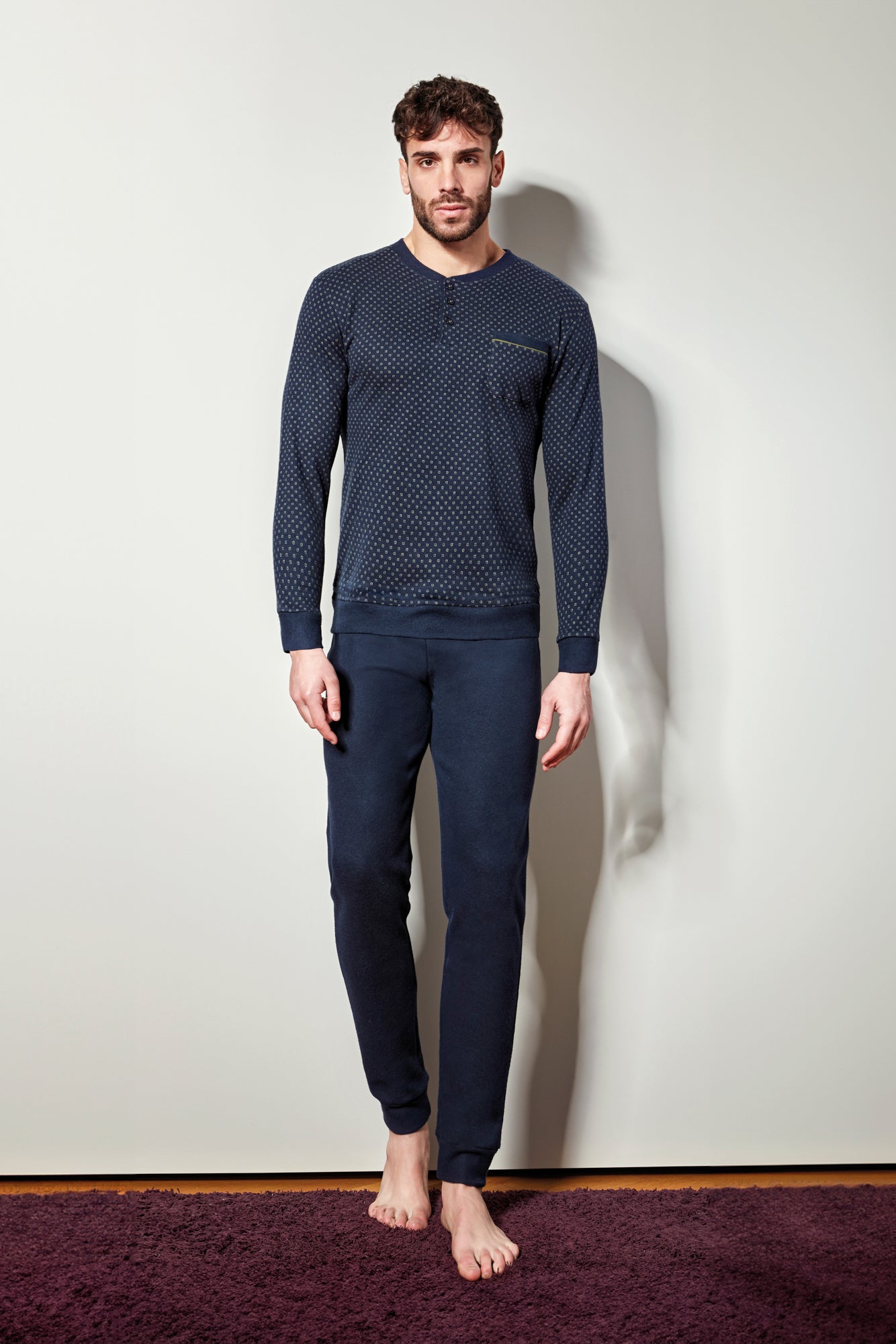Un pigiama in jacquard da uomo serafino e' un capo che coniuga il comfort del pigiama tradizionale con un tocco di eleganza sofisticata, grazie alla texture ricca del jacquard e alla praticita' dei bottoni. Composizione : 60%cotone-40%poliestere