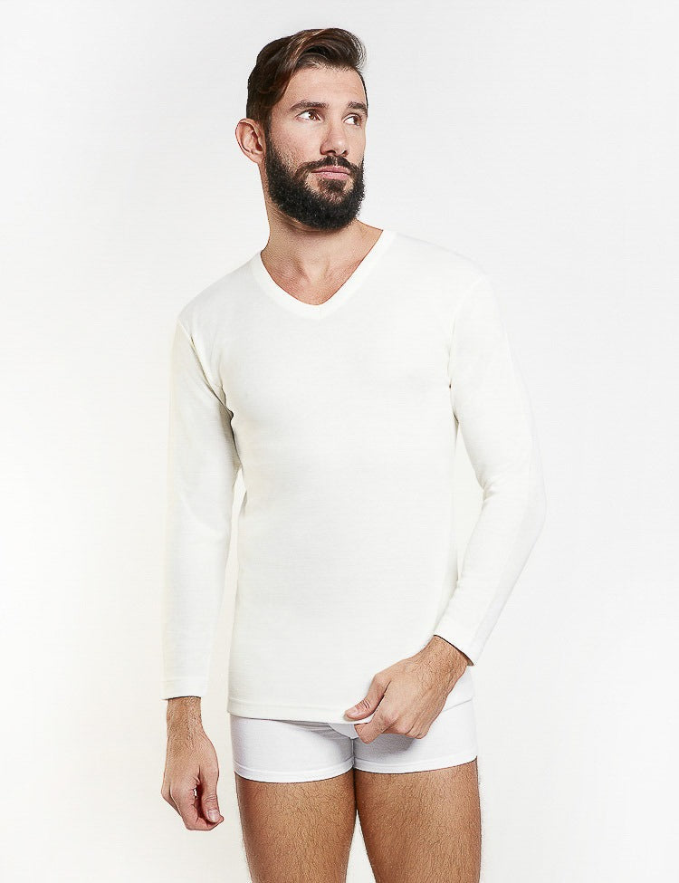 T-shirt scollo a V manica lunga esterno lana e interno cotone. Avvolge morbidamente il corpo Composizione : Int.:100%cotone/est.:50%lana-42%acrilico-8%nylon