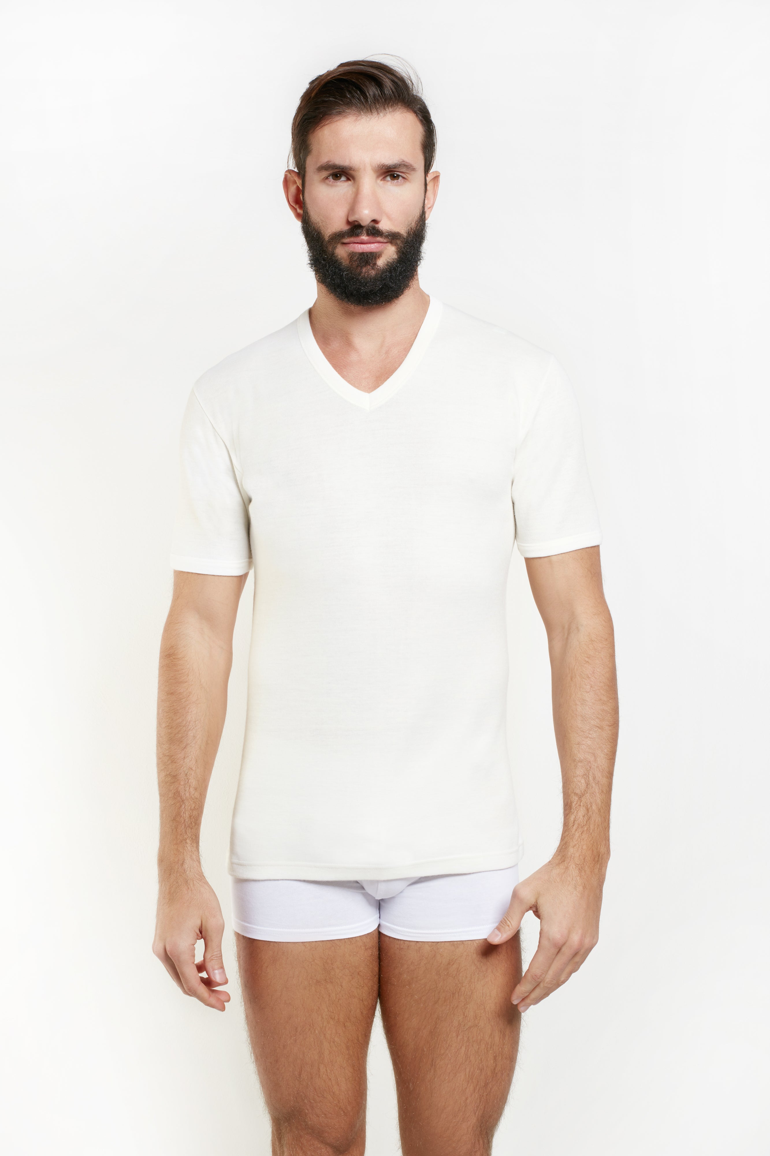 T-shirt scollo a V mezza manica esterno lana e interno cotone. Avvolge morbidamente il corpo Composizione : Int.:100%cotone/est.:50%lana-42%acrilico-8%nylon