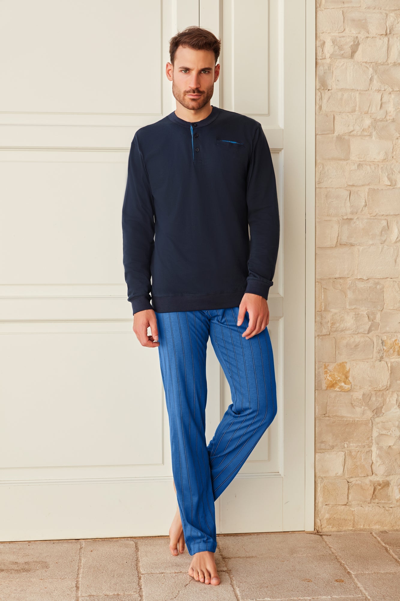 Comfort quotidiano e stile sobrio si incontrano in questo pigiama serafino lungo da uomo. La maglia a manica lunga presenta il classico scollo serafino con bottoncini, dettaglio funzionale che dona carattere al capo e permette una vestibilita' regolabile. Composizione : 100%cotone