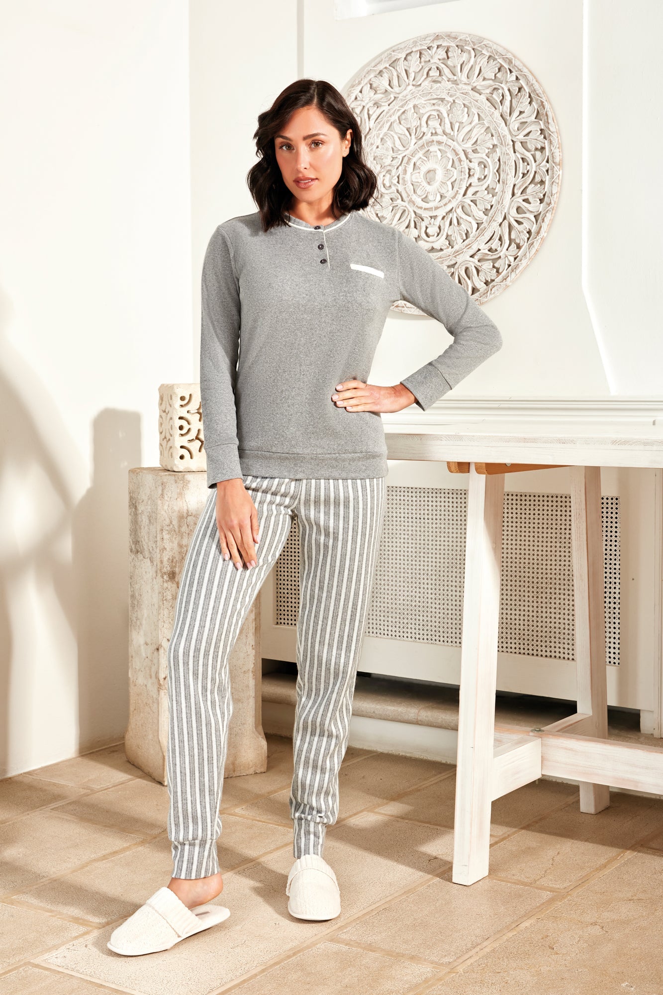 Raffinato e confortevole, questo pigiama in tessuto jacquard e' pensato per chi ama unire stile ed eleganza anche nei momenti di relax. Il tessuto jacquard,dona al capo un aspetto sofisticato e una morbida sensazione sulla pelle. Composizione : 65%poliestere-30%cotone-5%altrefibre