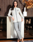 Un pigiama in jacquard da donna con giacca aperta e' un capo elegante e raffinato, perfetto per chi cerca comfort senza rinunciare alla stile. Il tessuto jacquard, tipico per la sua lavorazione a rilievo e il disegno decorativo, rende il pigiama molto piu' sofisticato. Composizione : 60%cotone-40%poliestiere