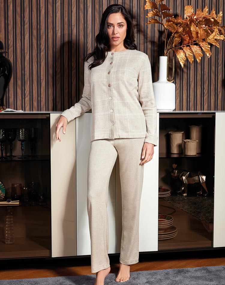 Un pigiama in jacquard da donna con giacca aperta e' un capo sofisticato e allo stesso tempo confortevole, perfetto per momenti di relax o per una notte di sonno elegante. Composizione : 60%cotone-40%poliestere