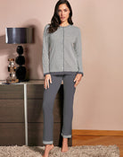 Pigiama aperto realizzato in caldo cotone, perfetto per le serate invernali.La giacca ha una vestibilita' comoda,con un colletto morbido e maniche lunghe, che avvolgono delicatamente le braccia. Il cotone e' morbido al tatto. Composizione : 100%cotone