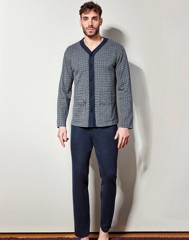 Un pigiama in jacquard da uomo con giacca aperta e' un capo elegante e raffinato, che unisce il comfort del pigiama tradizionale alla ricercatezza dei materiali e al design sofisticato. Composizione : 60%cotone-40%poliestere
