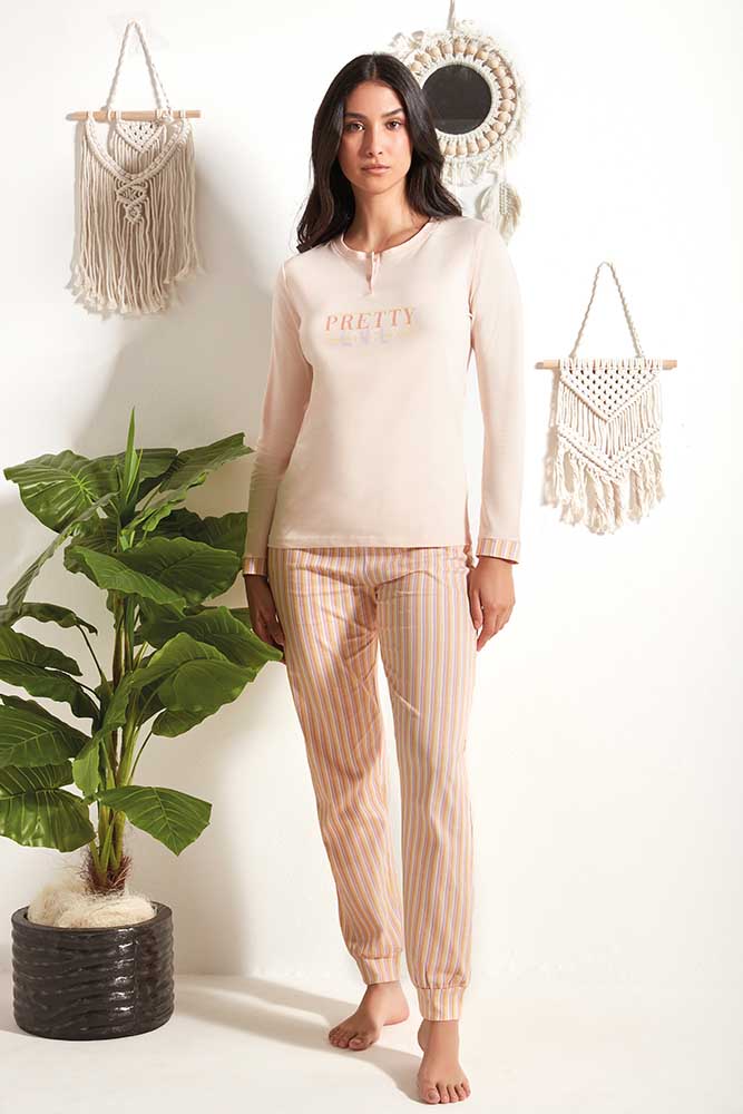 Il pigiama lungo in cotone e' il perfetto connubio tra comfort e praticita', ideale per ogni stagione.Composto da una maglia a maniche lunghe e pantaloni con polsini sul fondo.Il cotone,garantisce una sensazione di morbidezza sulla pelle. Composizione : 100%cotone